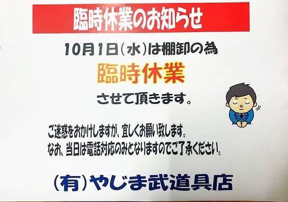 10月1日(水)は棚卸の為、臨時休業させて頂きます。